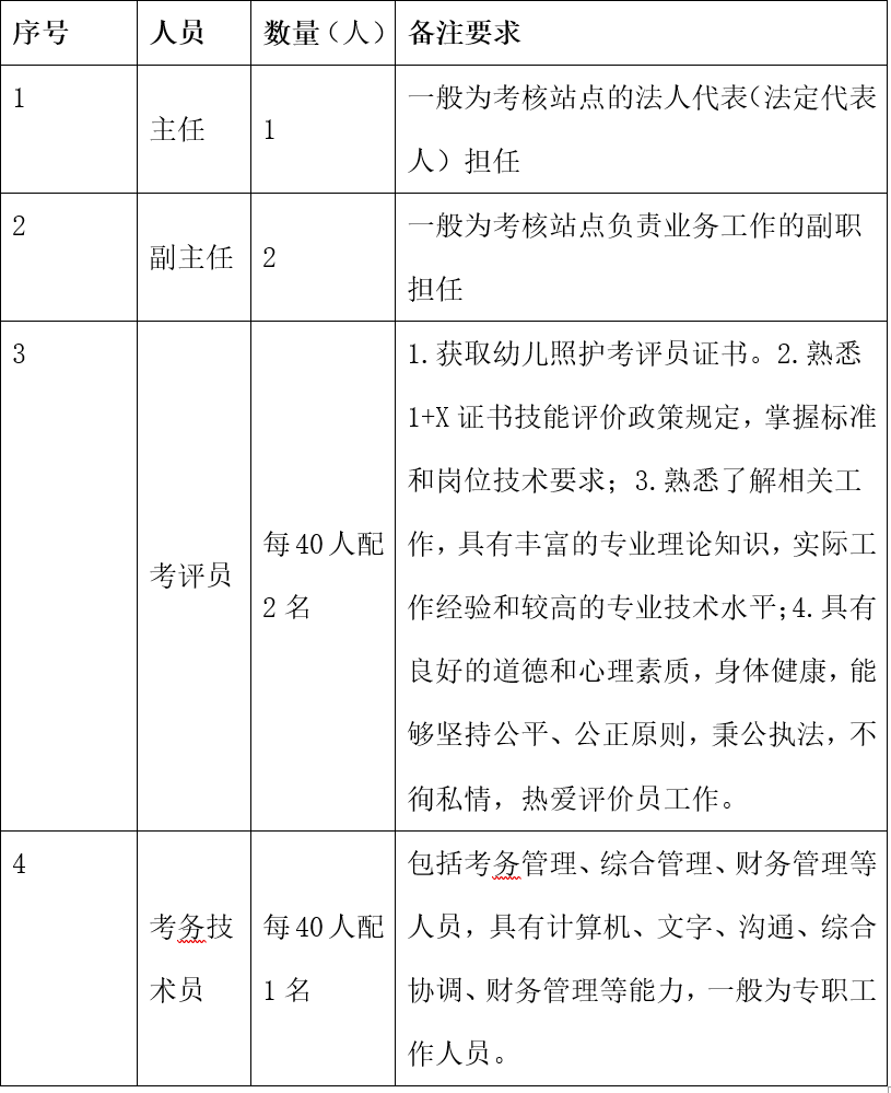 与此同时,还需确定主任与副主任3人,副主任负责具体考证系统的申报、维护等事宜,未来需承担一定的工作量。根据1+X幼儿照护师资培训,需有1名工作人员负责签到;2名工作人员候考留观;1名工作人员身份验证;2名工作人员抽题,理论考试每个考场2名监考人员,实操考试每2个工位2名考评人员。