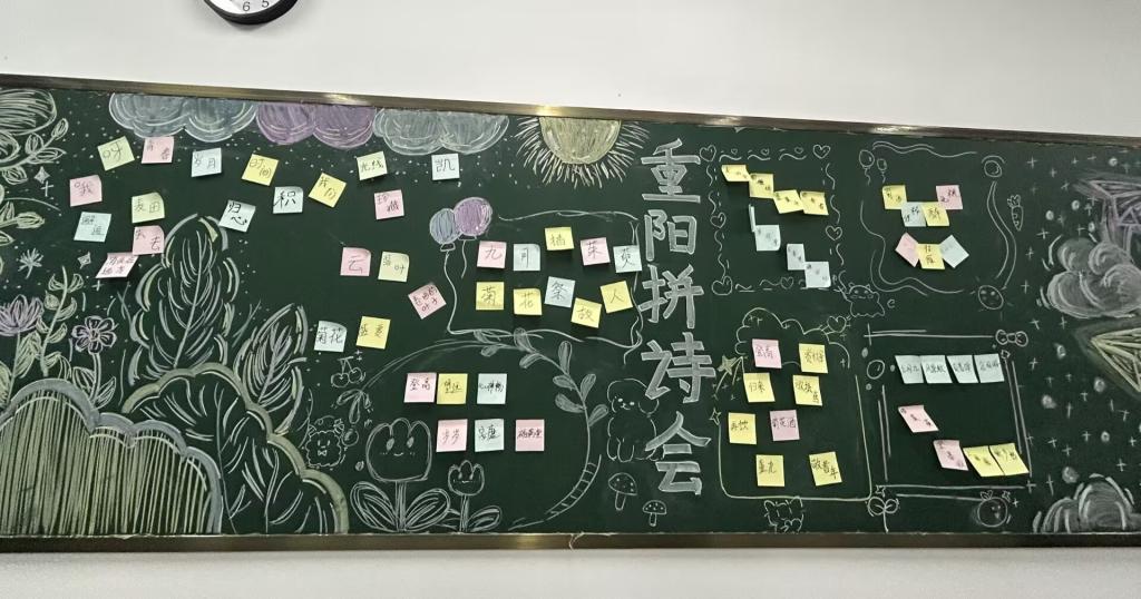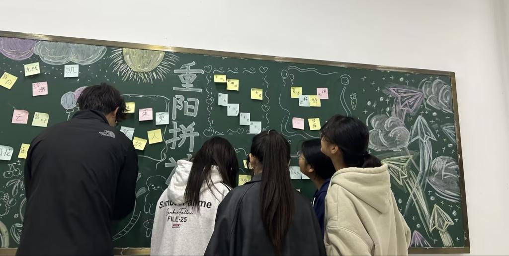 活动现场雅致温馨,精心筹备的定制诗句碎片成为核心亮点。“碎片”围绕菊、茱萸、秋山、登高、雁归、菊酒等重阳经典文化元素设计,“菊绽秋篱香满径”“茱萸斜插鬓边红”“登高遥寄故园情”等雅致佳句悉数收录,字里行间尽显传统韵味。活动中,同学们自由挑选诗句碎片,或凝神构思或交流探讨,以年轻视角诠释重阳意蕴,将古典意象与青春思考巧妙融合,一首首兼具古典雅致与时代气息的诗作接连诞生,让传统节日文化在创意重组中焕发新活力。