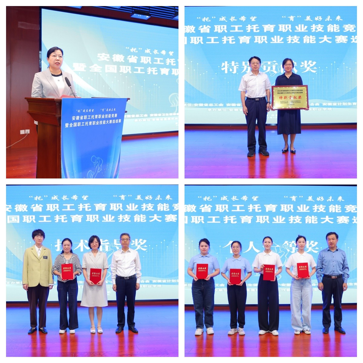 大赛以“‘托’成长希望 ‘育’美好未来”为主题,设置了婴幼儿发展引导员、保育师2个赛道。各参赛选手在赛场上同台竞技、尽展风采,以精湛的专业技能展现托育从业者的核心能力,以良好的职业素养诠释行业担当,以积极向上的精神风貌传递新时代托育工作者的活力与热情。大赛共角逐出个人一等奖4名、二等奖8名,三等奖16名,技术指导奖2名。合肥市保育师赛道代表队、宿州市婴幼儿发展引导员赛道代表队等12支代表队获团体奖,蚌埠、阜阳、滁州等9个市获优秀组织奖,学校获特别贡献奖。