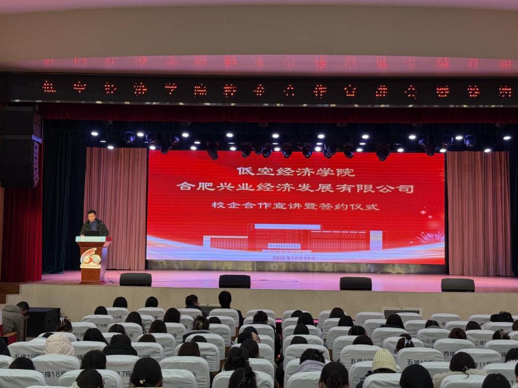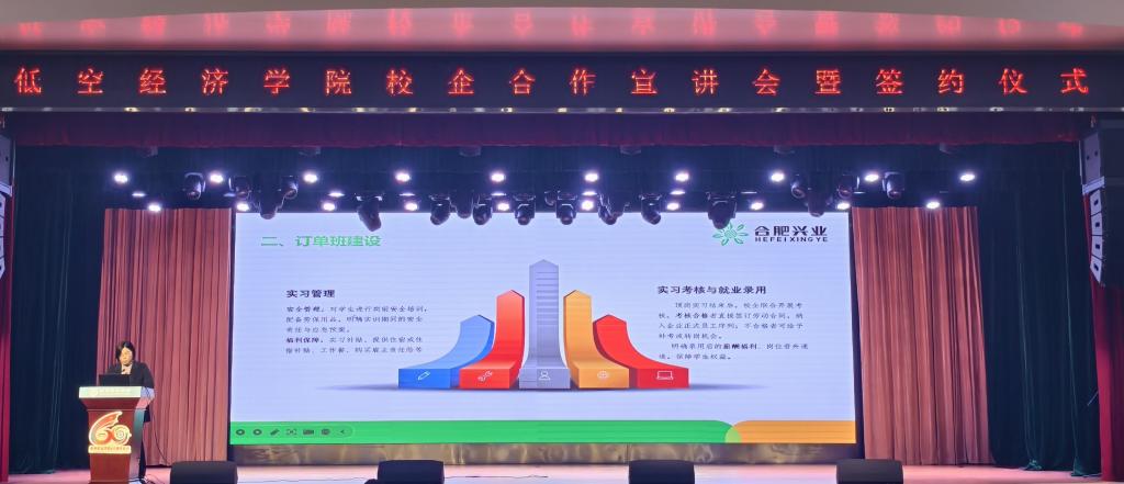 12月24日下午,低空经济学院与合肥兴业经济发展有限公司校企合作宣讲会暨签约仪式在学校槽郢校区大礼堂顺利举行。低空经济学院党总支副书记、副院长姬翔宇,合肥兴业经济发展有限公司人力资源部副部长葛千山等企业代表出席活动。仪式由低空经济学院党总支副书记周喆主持,学院师生代表近三百人参加。