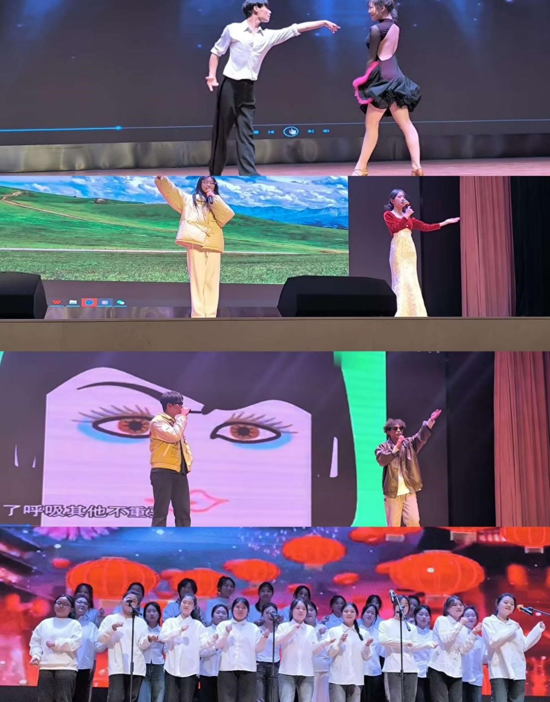 联欢会节目形式多样,精彩纷呈。歌舞《最炫民族风》以其热情奔放的旋律和活力四射的舞蹈,瞬间点燃现场气氛。《快乐拉丁》舞者们步伐轻盈,展现出独特的拉丁舞魅力。朗诵《祖国》《盛世中国》,同学们用激昂的声音表达对祖国的热爱与赞美。歌曲《于是》《烦恼歌》,歌手们深情演绎,引发观众共鸣。舞蹈《新年快乐“蛙”》可爱有趣,《寻茶》则展现出独特的东方韵味。歌舞《敕勒歌》带大家领略草原风光。最后,大合唱《新年快乐》为联欢会画上圆满句号。