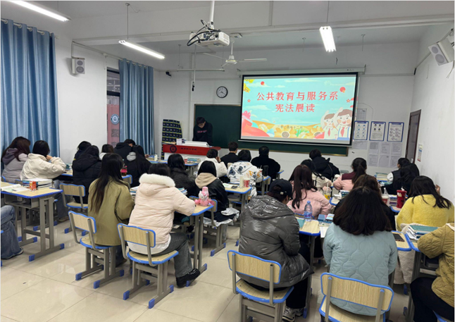 为深入贯彻落实法治教育,2024年12月4日,公共教育与服务系组织各班级开展了“宪法晨读”活动。