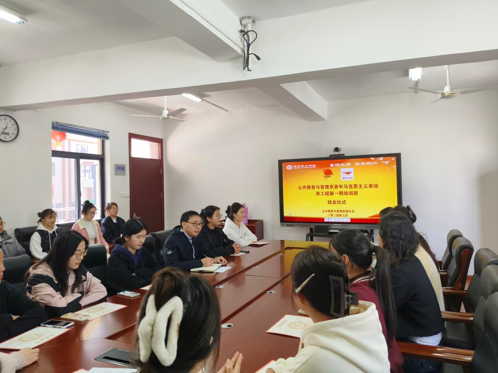 为全面贯彻落实党的二十大精神,充分发挥学生干部政治引领作用,培养和输送一批具有忠诚政治品格的青年骨干,3月19日中午,公共教育与管理系在槽郢校区综合办204会议室举行第一期“青马工程”培训班结业仪式,仪式由公共教育与管理系党总支副书记、系团总支书记宋邦林主持,培训班全体学员参加。
