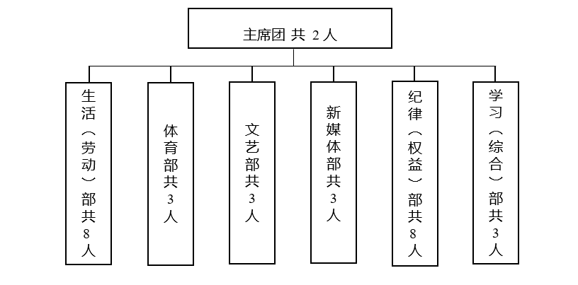 学生会主席团:集体负责学生会重大事项,不设主席、副主席,设执行主席,执行主席负责召集会议、牵头日常工作。执行主席实行轮值制度,由主席团成员轮值担任,以学期为一个轮值周期。